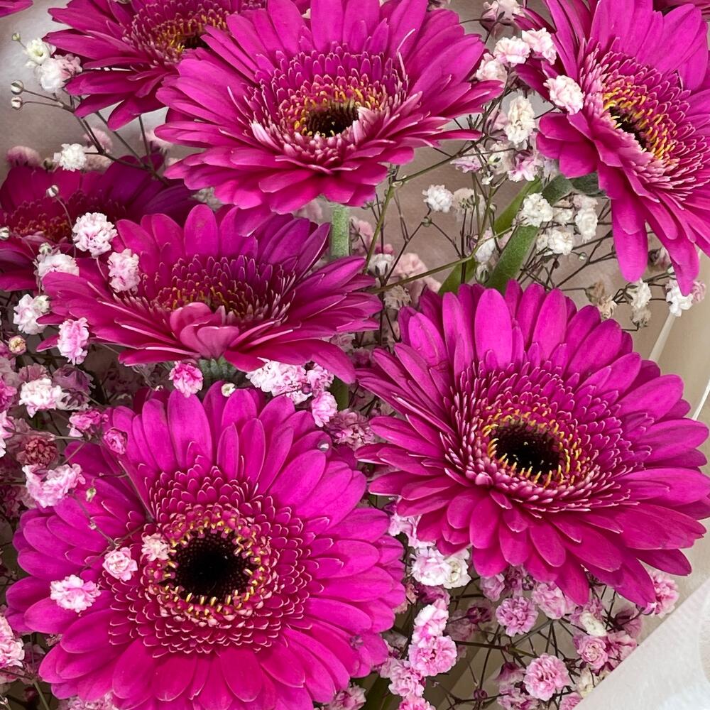 Гипсофила – 2 шт.Лента – 2 шт.Упаковка – 2 шт.Гербера мини – 11 шт.