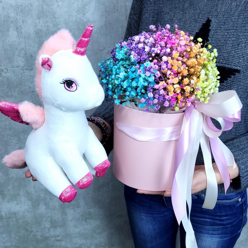 Единорог Евграф и коробочка с радужной гипсофилой
