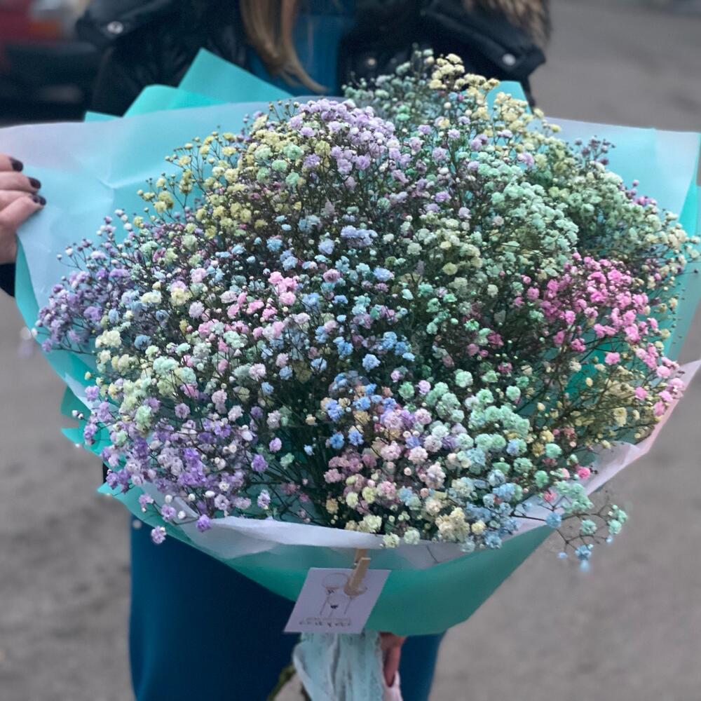 Лента – 2 шт.Карточка для подписи – 1 шт.Тишью белое – 2 шт.Пленка дизайнерская – 4 шт.гипсофила радужная ветка – 15 шт.