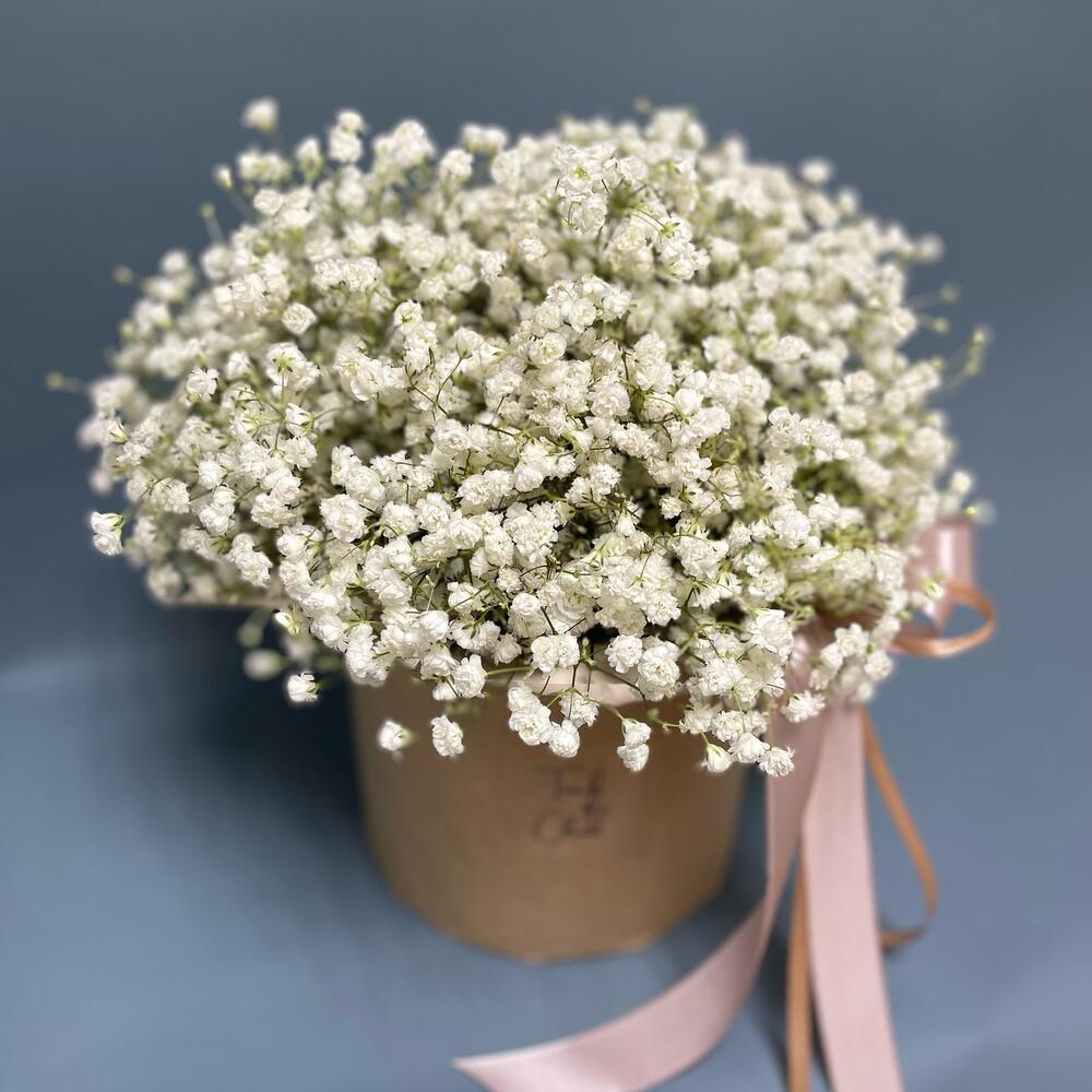 Гипсофила – 9 шт.Коробка шляпная – 1 шт.Оазис флористический – 1 шт.Лента атласная – 2 шт.