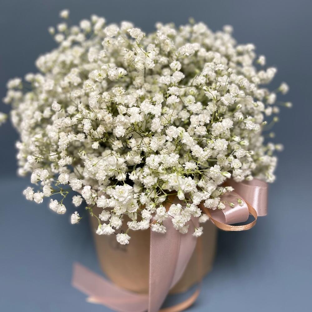 “Сиреневый туман” – композиция из гипсофилы в шляпной коробке
