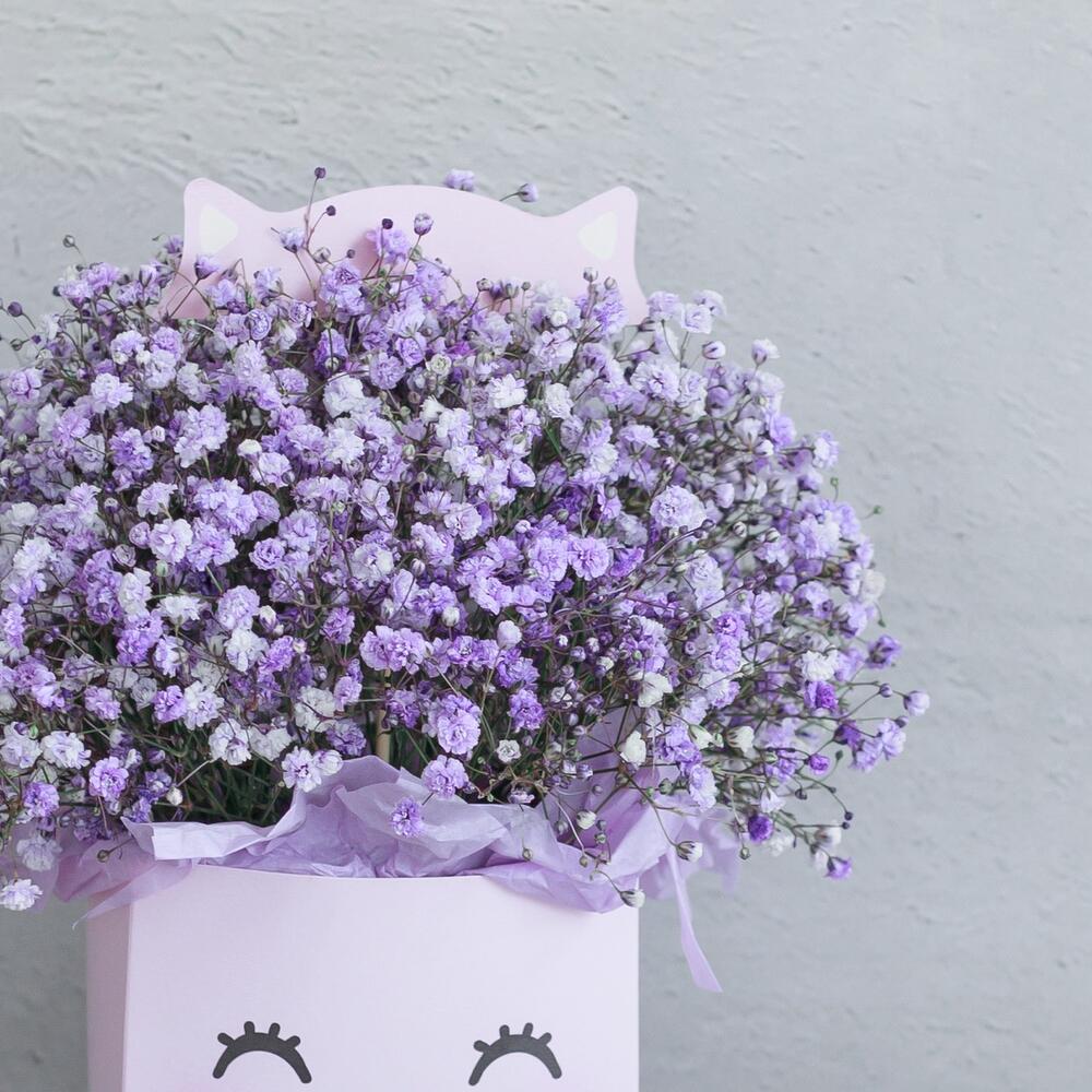 Тишью – 4 шт.Оазис флористический – 1 шт.коробка транспортировочная – 1 шт.коробка котик – 1 шт.гипсофила цветная – 5 шт.