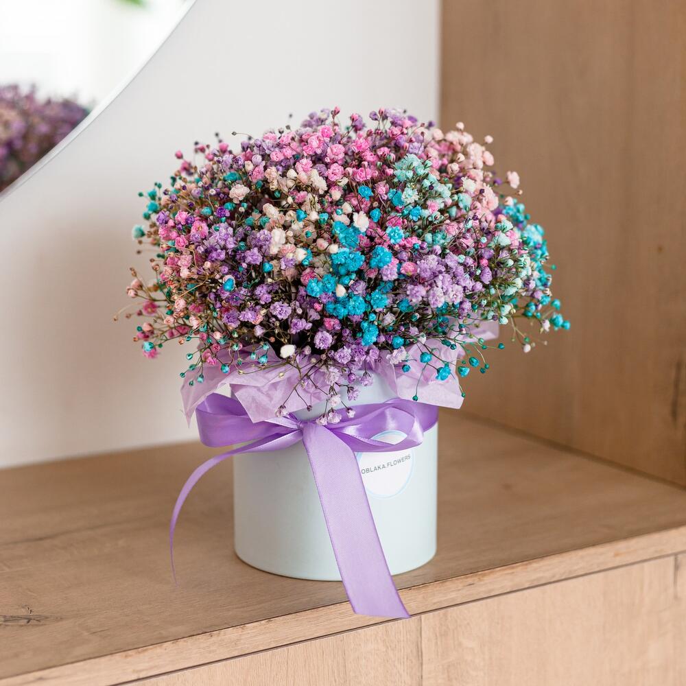 гипсофила цветная – 5 шт.Коробка шляпная – 1 шт.бумага дизайнерская – 1 шт.Лента атласная – 1 шт.Губка флористическая – 1 шт.