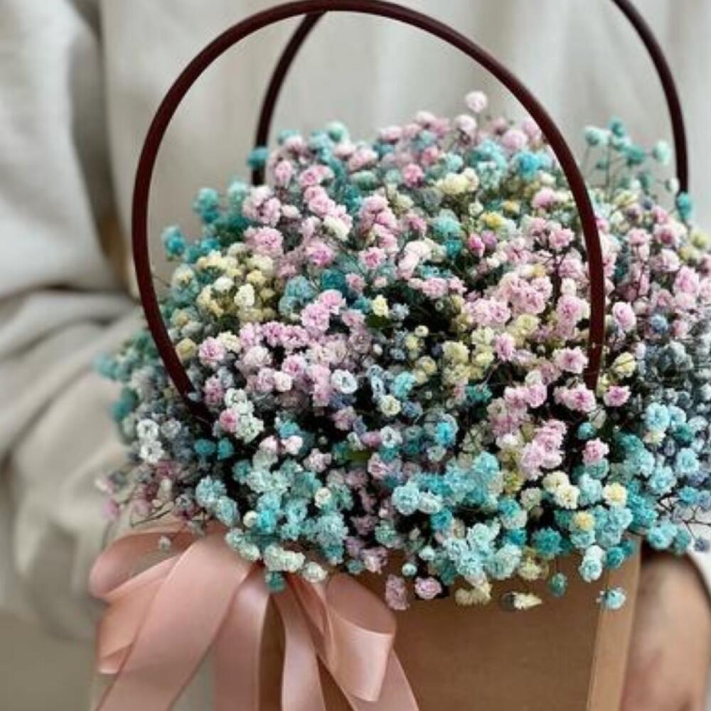 “Сиреневый туман” – композиция из гипсофилы в шляпной коробке