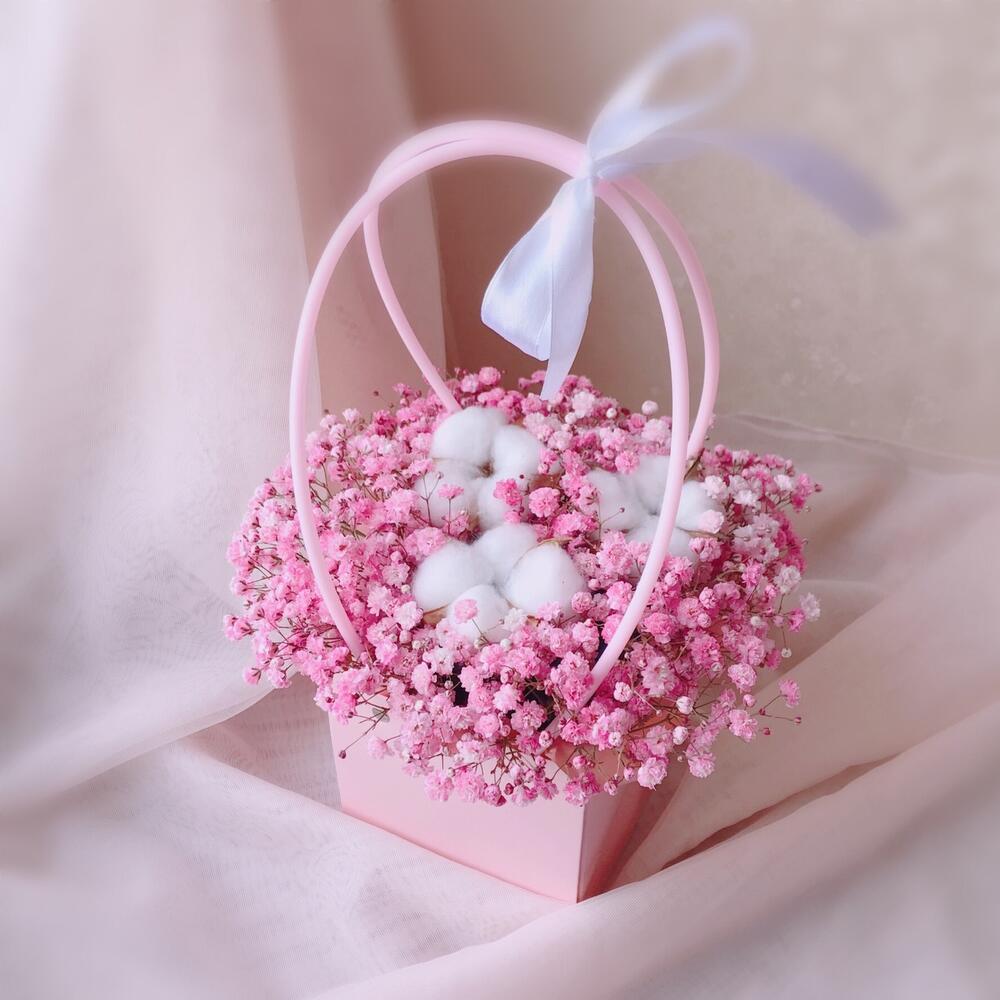 Очаровательная композиция из изысканных свежих цветов.Наполнена множеством соцветий розовой гипсофилы и мягкого хлопка. Собрана в стильной сумочке.Композиция из гипсофилы – необычный подарок, который удивит своей невероятной стойкостью, при правильном и простом уходе.❤️ Ставить композицию в прохладном месте, избегая отопительных приборов и прямых солнечных лучей. ❤️ Подливать немного воды в серединку.Гипсофила не вянет, а становится сухоцветом, сохраняя свой вид. Поэтому композиция продолжит радовать ещё очень долго!Чтобы защитить готовый букет во время доставки от любых погодных условий, мы бережно его упаковываем
