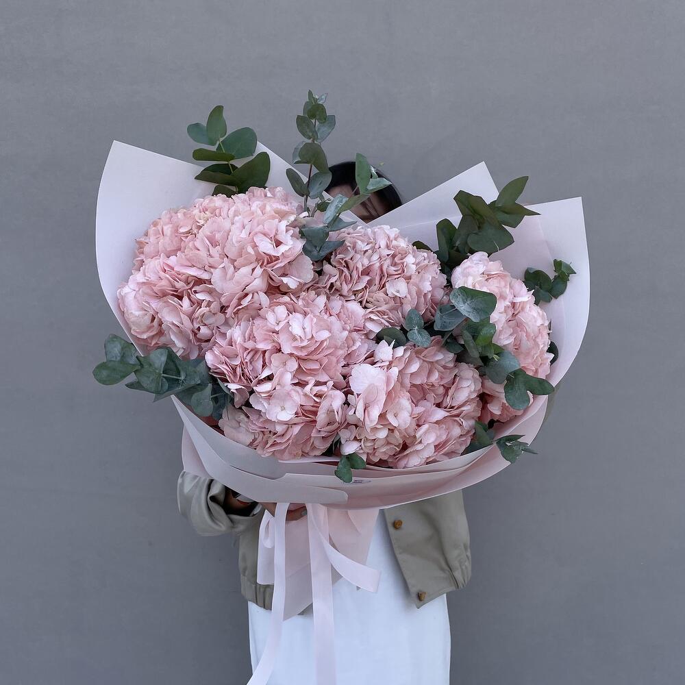 Объемный букет из королевских гортензий с добавлением эвкалипта.