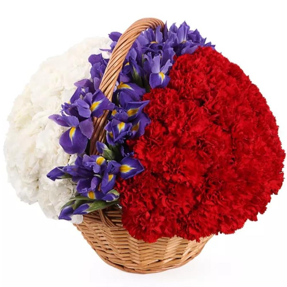 Гвоздика – 80 шт.Ирис – 21 шт.Корзина большая – 1 шт.Оазис флористический – 3 шт.
