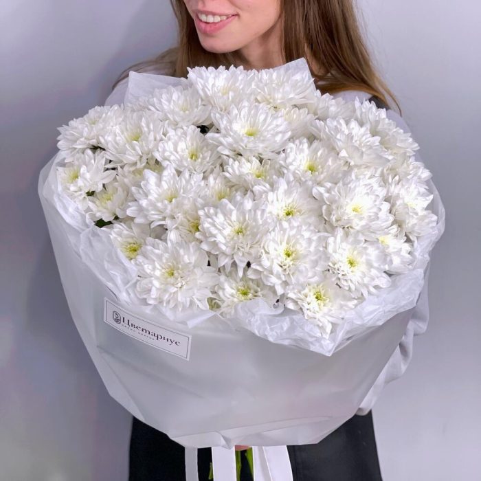 Стильный и очень стойкий монобукет из белых кустовых хризантем.Пушистое облако снова в тренде! Букет непременно порадует ту, которую Вы любите!