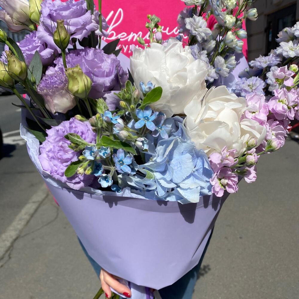 Пион – 2 шт.Гортензия – 1 шт.Дельфиниум – 3 шт.Лизиантус – 2 шт.Оксипеталум – 3 шт.Маттиола – 3 шт.Эвкалипт – 3 шт.Фисташка – 3 шт.Упаковка дизайнерская – 1 шт.