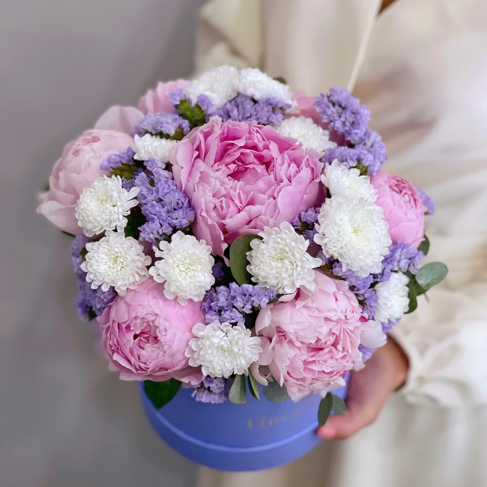 пионы розовые премиум – 7 шт.Статица лавандовая – 2 шт.Сантини – 3 шт.Эвкалипт – 2 шт.Шляпная коробка – 1 шт.