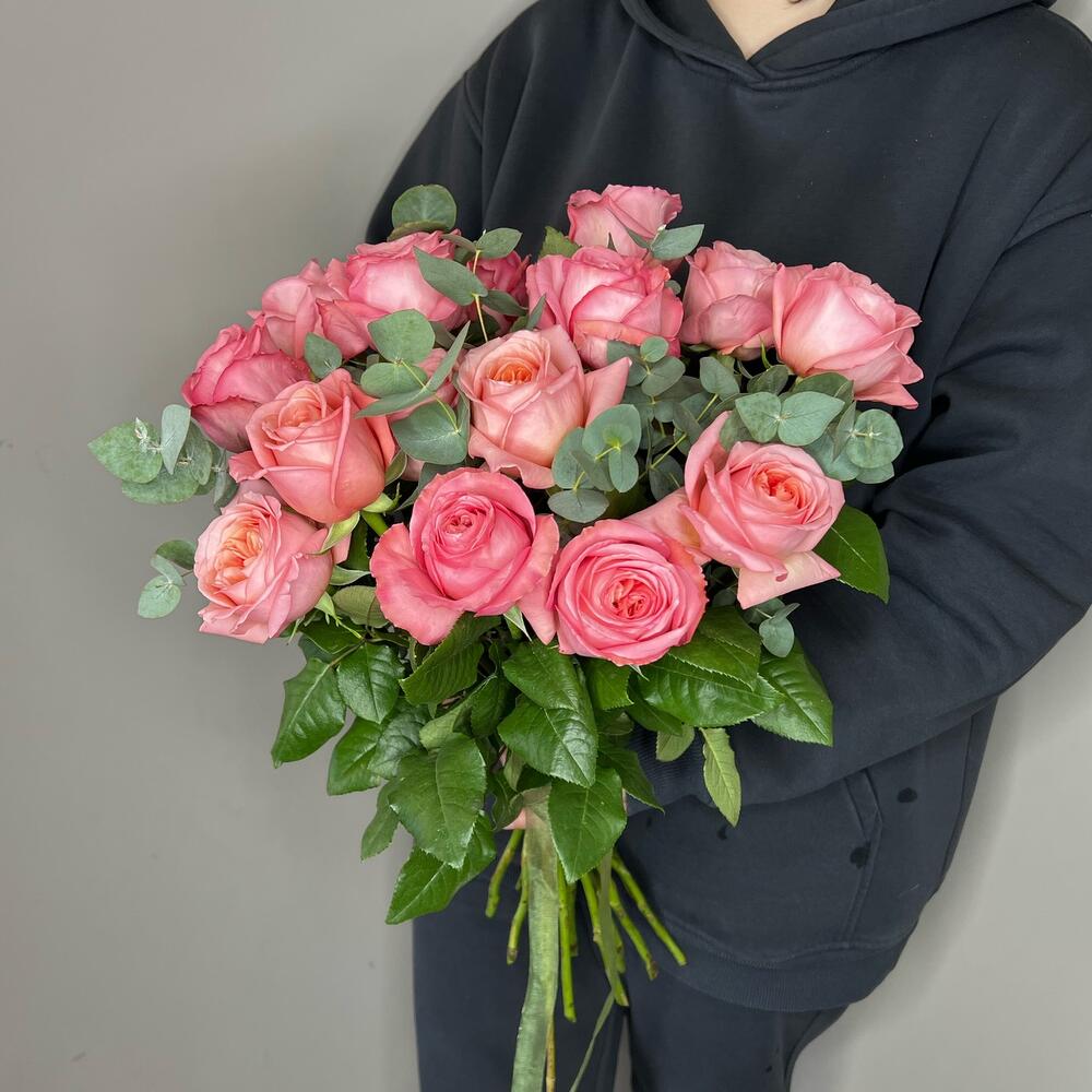 15 пионовидных роз с эвкалиптом