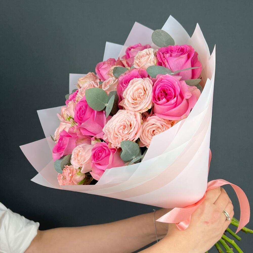 Авторский букет из розовых Пионовидных Роз и Эвкалипта