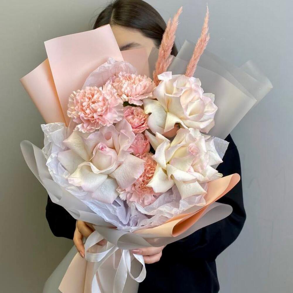 Альстромерии, Кустовые розы, Лизиантусы, Пионовидные розы, Розы, Ромашки