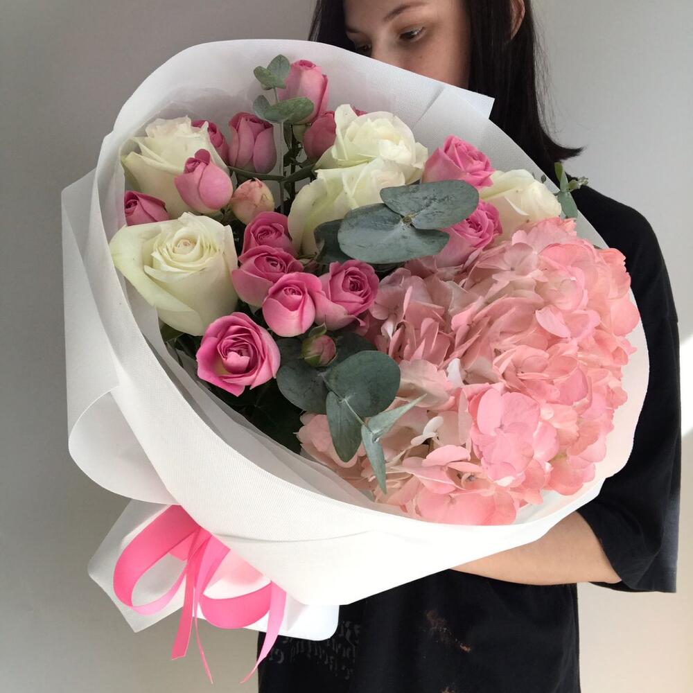 “Эвкалиптическая роскошь” гортензия и пионовидная кустовая роза