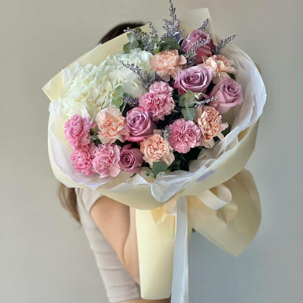 Альстромерии, Гортензии, Кустовые розы, Лизиантусы, Розы, Хризантемы