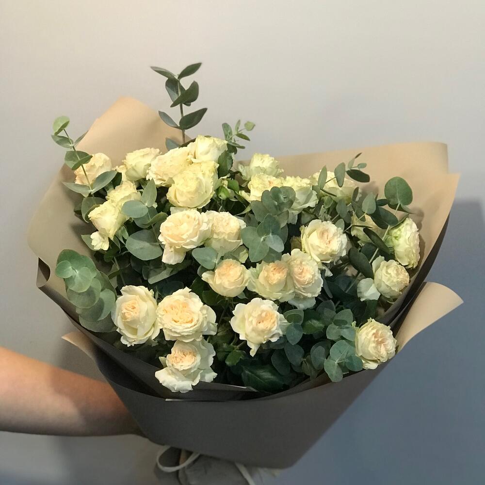 роза кустовая пионовидная саммер – 5 шт.эвкалипт цинерея пучок – 1 шт.Упаковка дизайнерская – 1 шт.