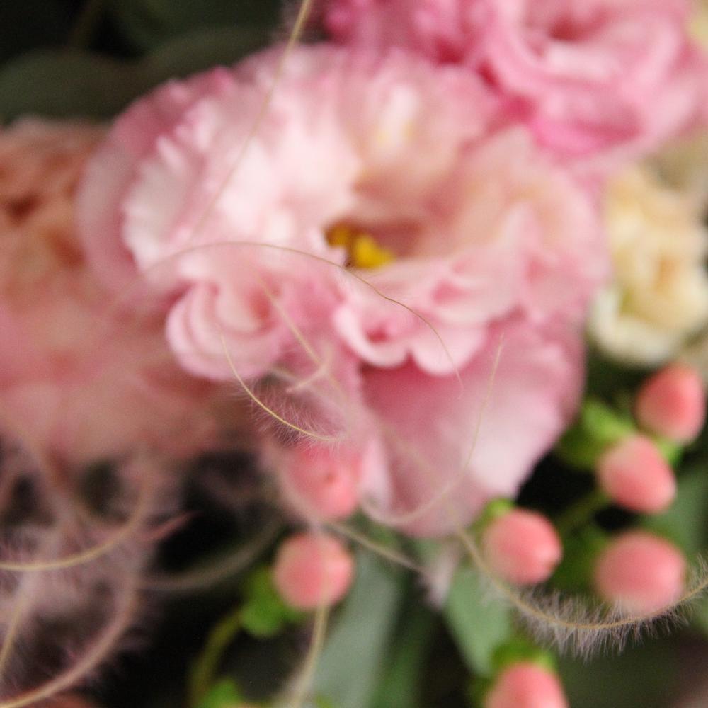 Роза пионовидная кустовая – 2 шт.Маттиола – 3 шт.Лизиантус – 4 шт.Гвоздика – 4 шт.Хиперикум – 2 шт.Ковыль – 2 шт.Эвкалипт – 7 шт.Тишью – 2 шт.Крафт – 2 шт.Лента атласная – 1 шт.