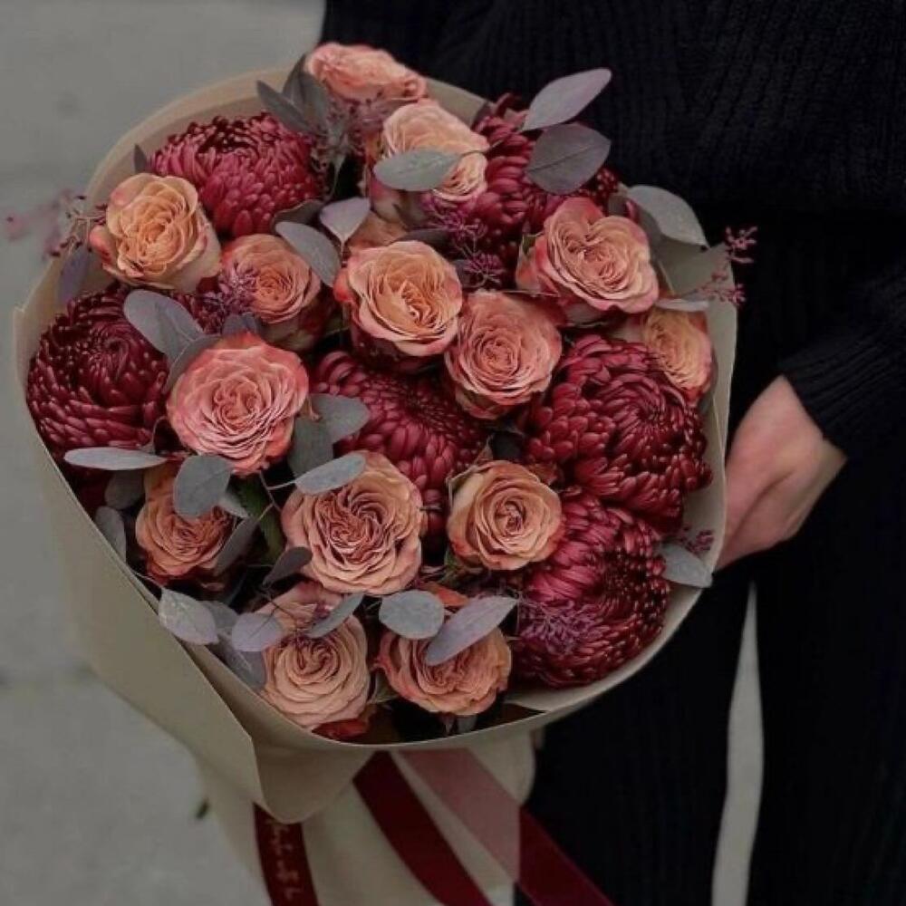 Альстромерии, Гортензии, Кустовые розы, Лизиантусы, Розы, Хризантемы