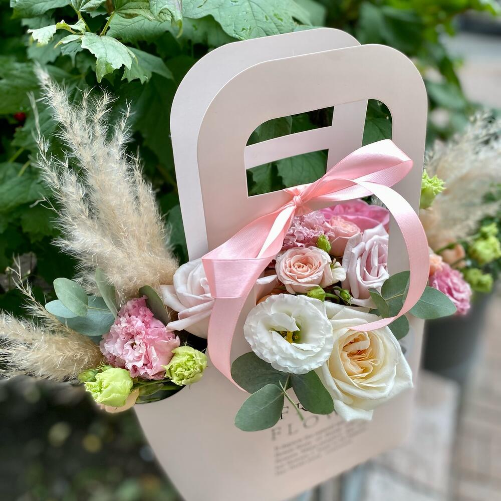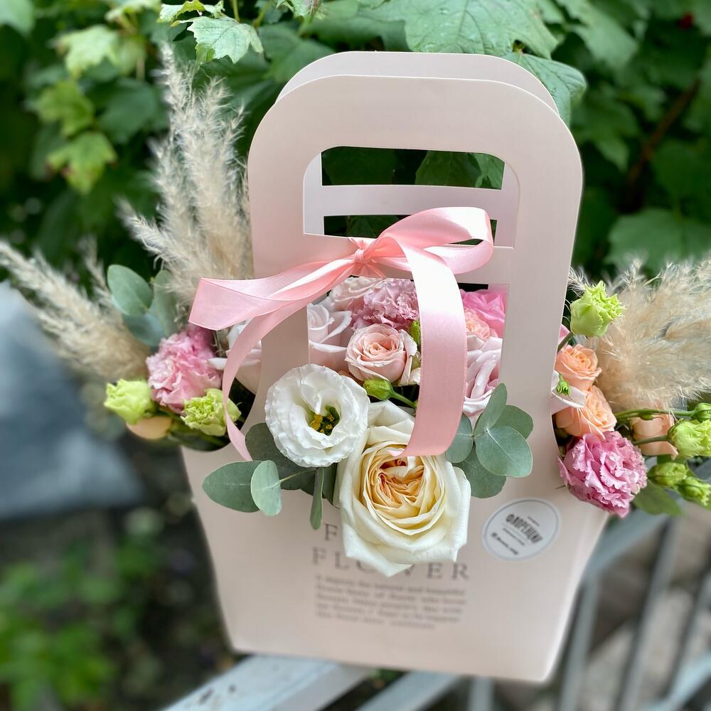 Роза пионовидная – 2 шт.Роза кустовая пионовидная – 2 шт.Эустома – 5 шт.Роза Эквадор – 3 шт.Эвкалипт – 3 шт.пампасная трава – 3 шт.Пакет крафт – 1 шт.Губка оазис – 1 шт.Лента атласная – 1 шт.