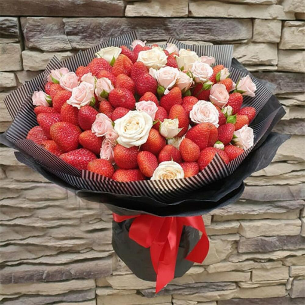 клубника свежая – 45 шт.Кустовая роза – 7 шт.Упаковка – 2 шт.