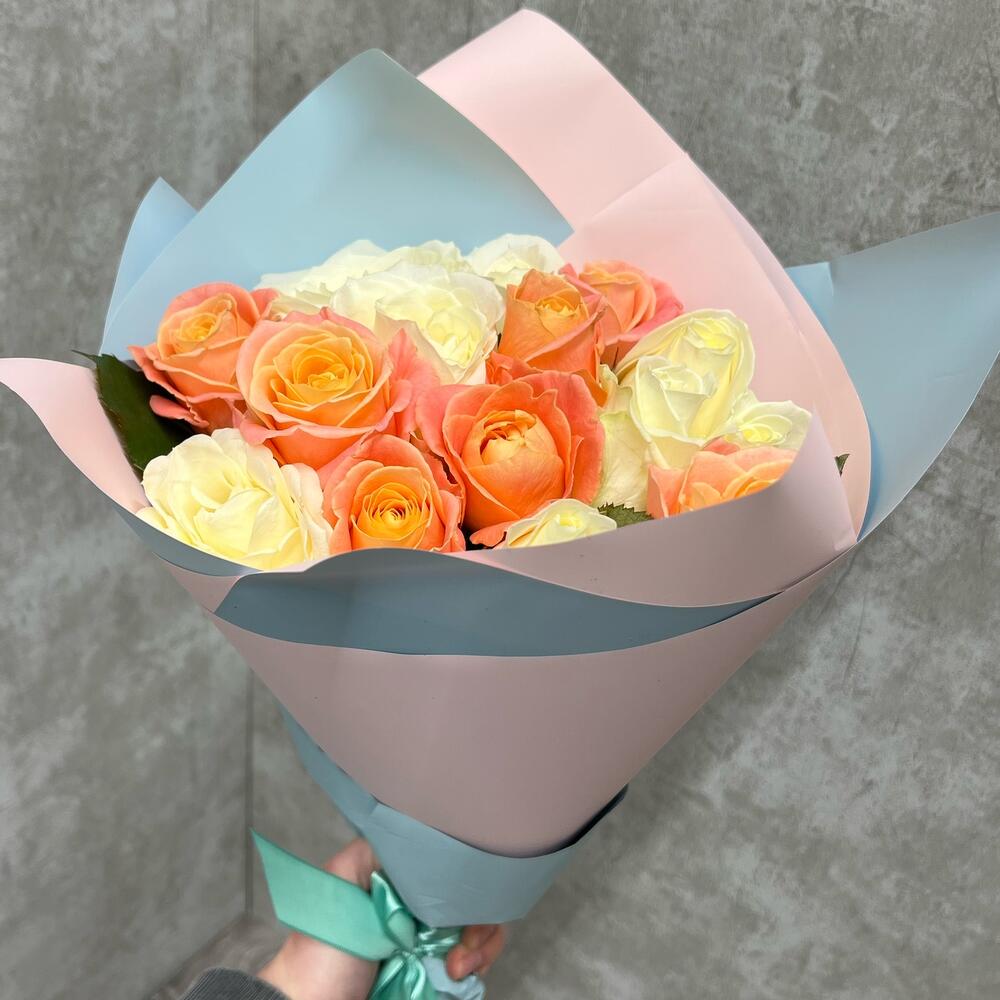 белая роза аваланж – 8 шт.Роза Мисс Пигги – 7 шт.Упаковка дизайнерская – 1 шт.Лента – 1 шт.