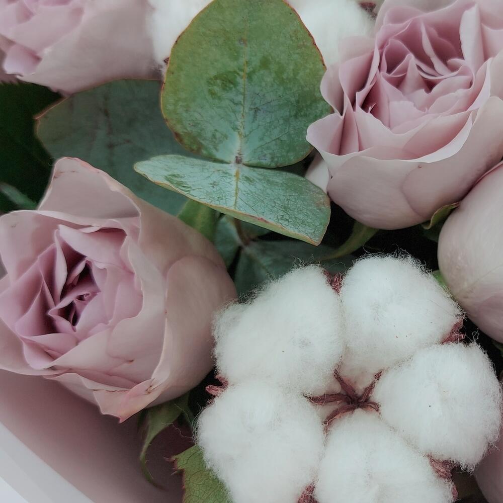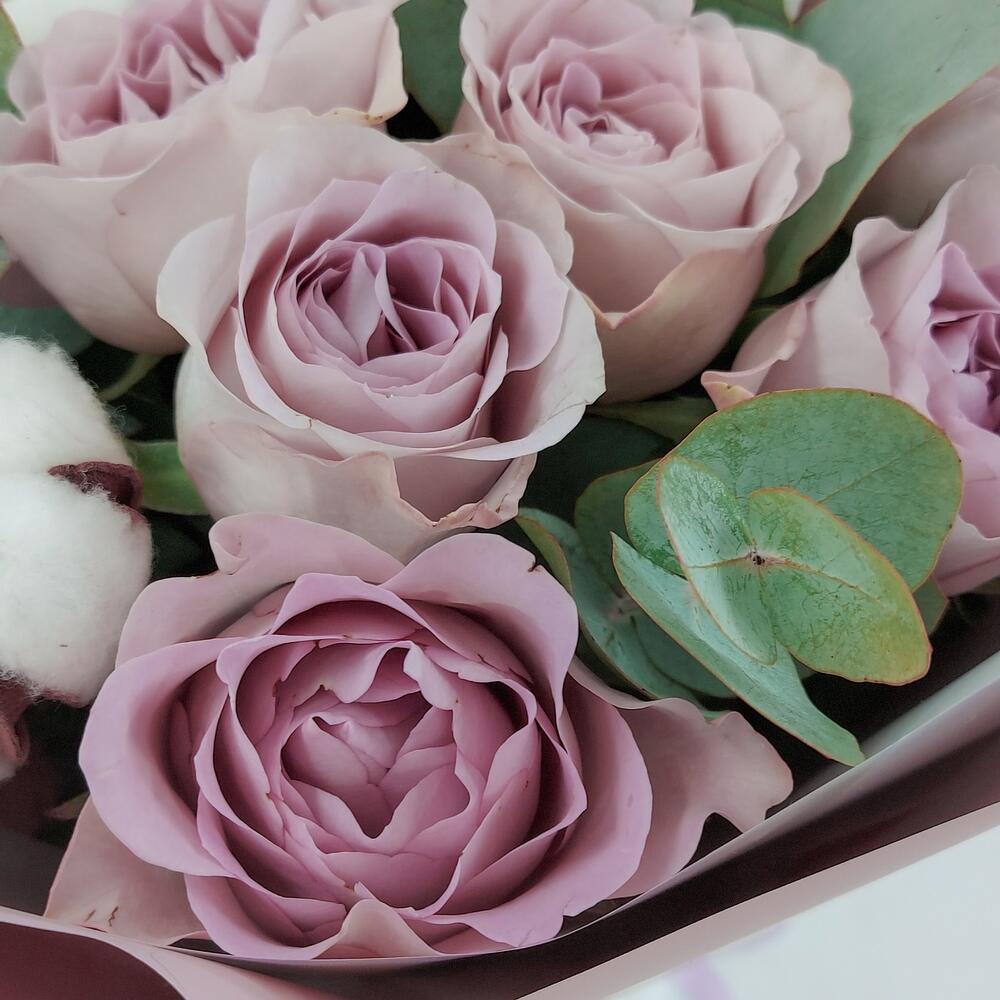 Эвкалипт – 4 шт.Роза сиреневая – 11 шт.Упаковка дизайнерская – 1 шт.Пистация – 2 шт.хлопок коробочки – 3 шт.