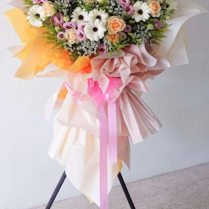Лимониум – 10 шт.Солидаго – 10 шт.Роза – 15 шт.Эустома – 10 шт.Подставка – 1 шт.Упаковка дизайнерская – 7 шт.Оазис флористический – 6 шт.герберы – 10 шт.