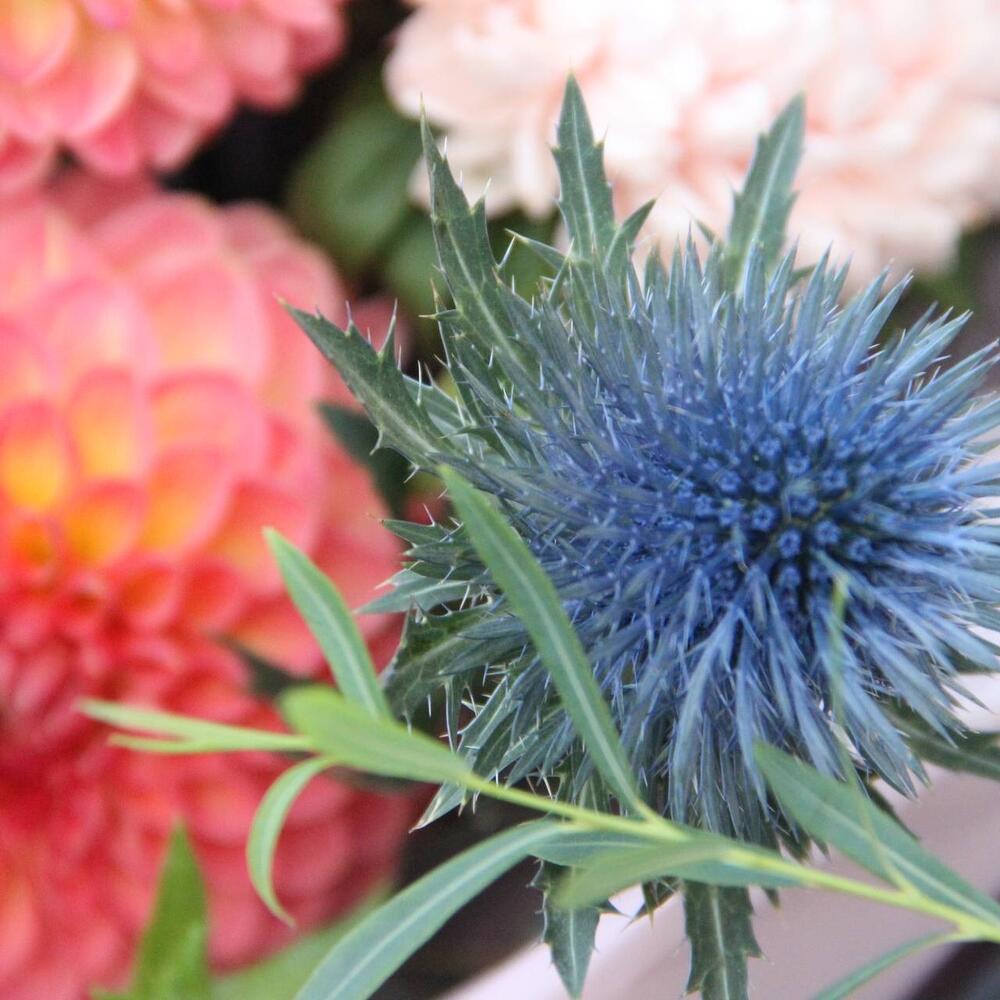 Эрингиум – 1 шт.книффония – 2 шт.Роза пионовидная – 2 шт.Астра – 3 шт.Клематис – 1 шт.Мята – 2 шт.эвкалипт стабилизируемый – 2 шт.Эвкалипт – 3 шт.Фисташка – 3 шт.Упаковка – 1 шт.