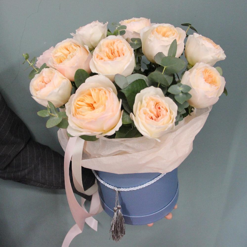 Шляпная коробка с 15 пионовидными английскими розами и эвкалиптом.Стильное цветочное решение для любого случая.Ширина композиции около 40смВысота композиции около 50см.