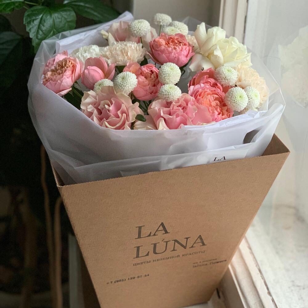 Гвоздика кремовая – 3 шт.Лента атласная – 1 шт.Упаковка дизайнерская – 2 шт.Кризал (подкормка) – 1 шт.Аквапак – 1 шт.Транспортировочная коробка – 1 шт.Роза pink mondial – 3 шт.Роза кустовая julliette – 2 шт.гвоздика белая сортовая – 1 шт.хризантема coconut – 3 шт.инструкция по уходу за цветами – 1 шт.роза playa blanca – 1 шт.