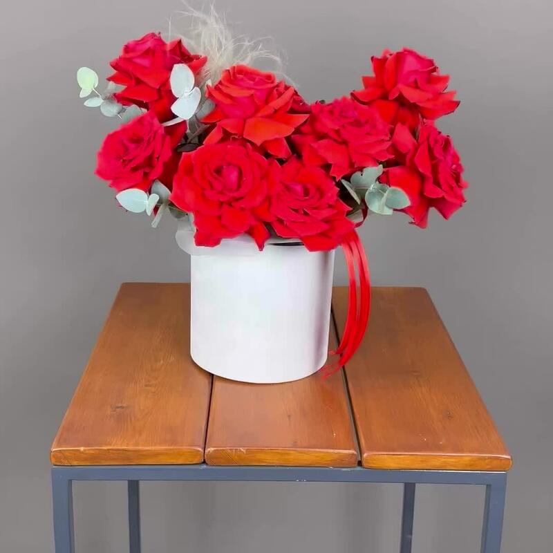 Шляпная коробка – 1 шт.Роза французская – 13 шт.Эвкалипт пучок – 1 шт.Оазис флористический – 1 шт.Дизайнерская упаковка – 1 шт.стифа пучок – 1 шт.