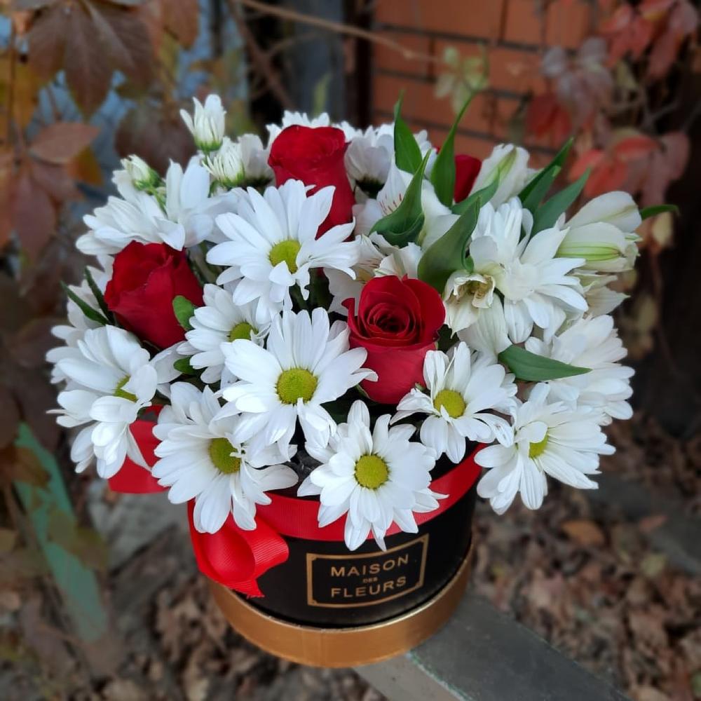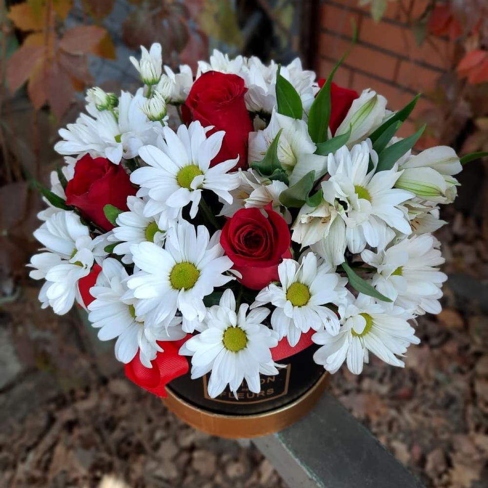 Роза красная – 5 шт. Коробка шляпная – 1 шт. Альстромерия белая – 3 шт. Хризантема белая кустовая – 3 шт.