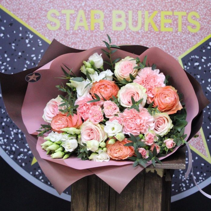 роза фруттето – 5 шт.Роза пионовидная кахала – 4 шт.Эустома – 3 шт.пионовидная кустовая роза мадам бомбастик – 2 шт.Диантус – 3 шт.Эвкалипт – 3 шт.Пленка матовая – 3 шт.Лента атласная – 2 шт.