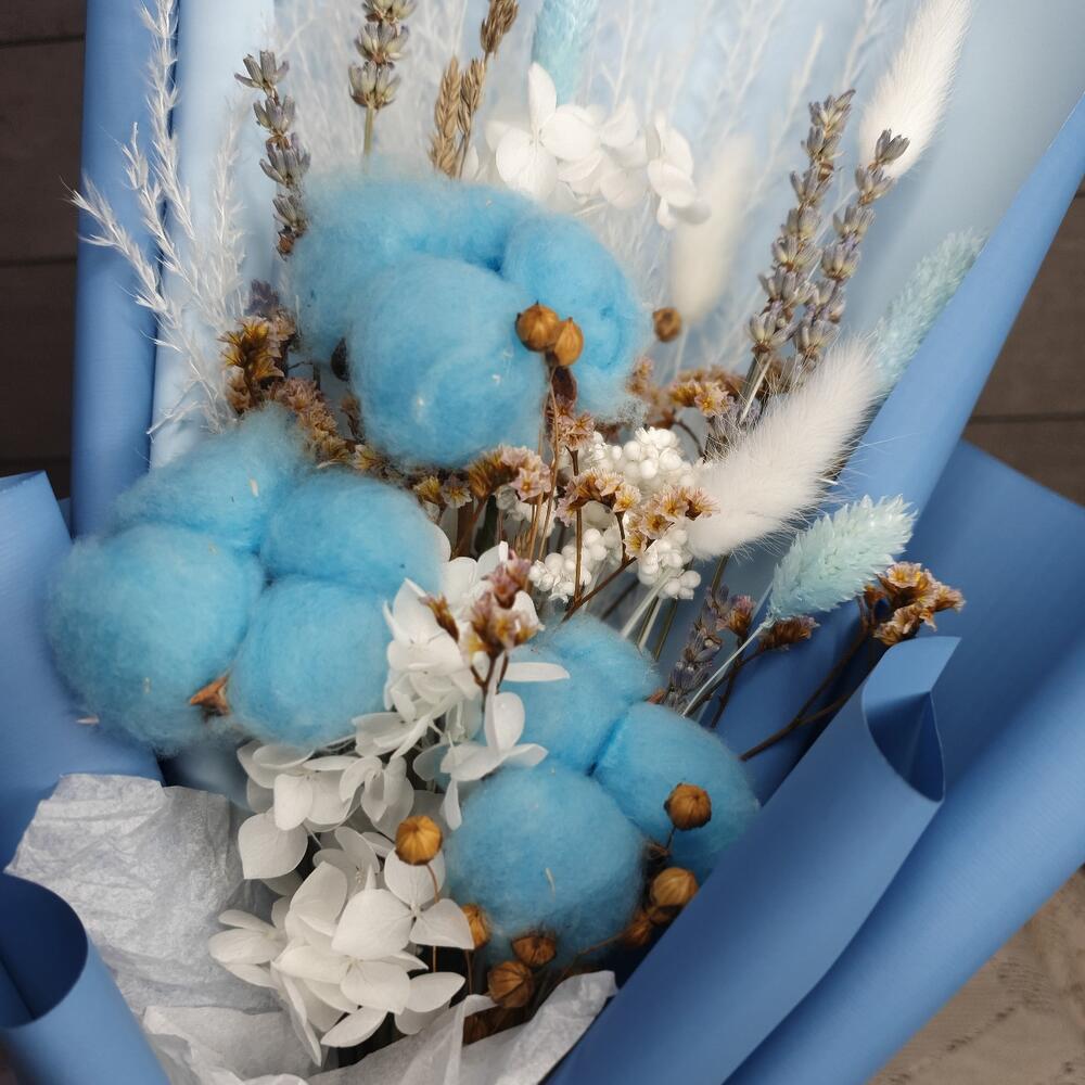 Хлопок – 3 шт.гортензия стабилизированная пучок – 1 шт.Лагурус – 3 шт.Фаларис – 4 шт.лавандин пучок – 1 шт.мискантус – 2 шт.статица стабилизированная – 1 шт.Лен – 3 шт.сорго – 1 шт.