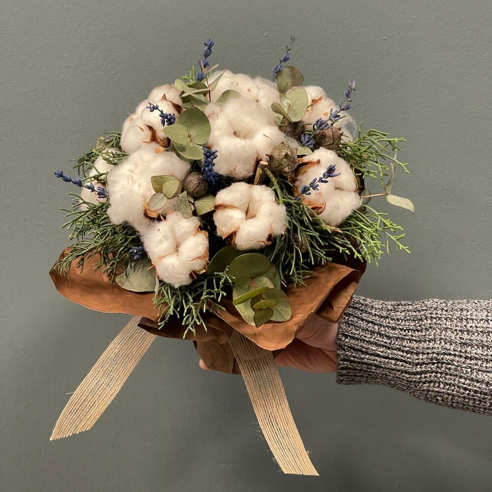 Хлопок натуральный – 13 шт.Лаванда (сухоцвет) – 11 шт.Эвкалипт – 1 шт.Фисташка – 1 шт.стакан кофейный – 1 шт.бумага упаковочная – 1 шт.Лента – 1 шт.