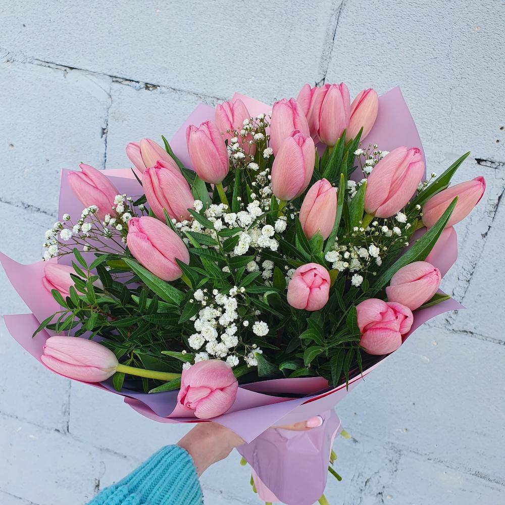 Тюльпан – 21 шт.Фисташка – 3 шт.Гипсофила – 1 шт.Упаковка дизайнерская – 1 шт.